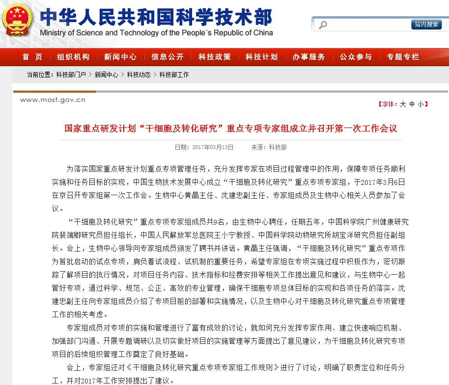 為落實(shí)國(guó)家重點(diǎn)研發(fā)計(jì)劃重點(diǎn)專項(xiàng)管理任務(wù),充分發(fā)揮專家在項(xiàng)目過程管理中的作用,保障專項(xiàng)任務(wù)順利實(shí)施和任務(wù)目標(biāo)的實(shí)現(xiàn),中國(guó)生物技術(shù)發(fā)展中心成立“干細(xì)胞及轉(zhuǎn)化研究”重點(diǎn)專項(xiàng)專家組,于2017年3月6日在京召開專家組第一次工作會(huì)。生物中心黃晶主任、沈建忠…